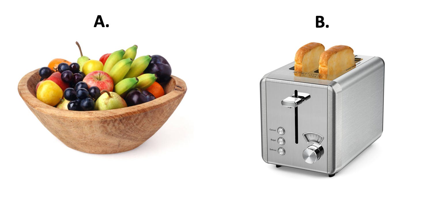 The correct answer is B, the toaster, because of the interconnections that form interdependencies between the parts. The knobs, electrical wiring, heating elements all work together to make toast - remove any one element and the toaster would not work. In the fruit bowl, you can replace one fruit with another fruit and it will still be a fruit bowl. The components do not depend on each other, unlike a toaster.